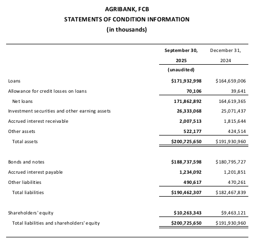 ST. PAUL, Minn., November 6, 2025 – Today, St. Paul-based AgriBank announced financial results for the third quarter of 2025, with strong profitability, credit quality, and liquidity and capital.